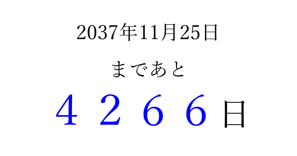 2037年11月25日(水)まで あと 9999 日です 追加すると、トップページからすぐ選べるようになります ※2026/03/22現在の結果です。 最新の状態に更新する ↓シェアして、タイムライン上にカウントダウンを表示しよう!↓ 📤 この結果を共有する Tweet シェア Threads Bluesky 別の日付でカウントダウン 2037年11月のカレンダー このページをブックマークに追加すると、いつでもカウントダウンを確認できます。 (PC: Ctrl+D / Mac: ⌘+D) hitome-notes.comでは以下のページも運営しています。 指定日と期間から日付を計算 | ガチャ確率計算・シミュレーション | プライバシー・ポリシー 運営者:Avocado