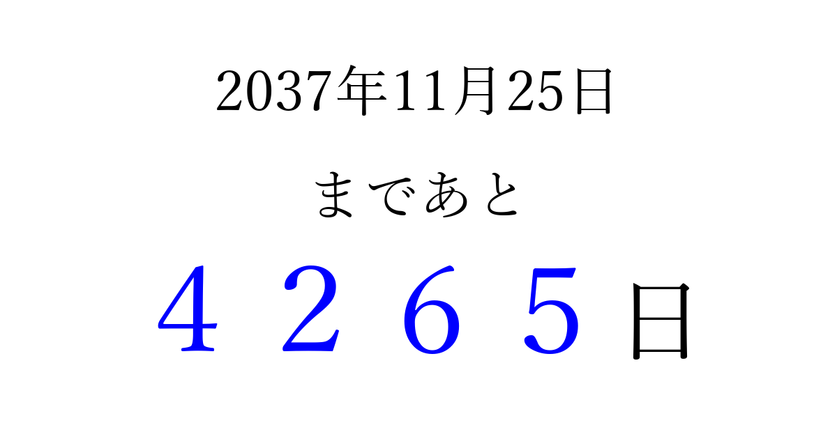 2037年11月25日(水)まで あと 9999 日です 追加すると、トップページからすぐ選べるようになります ※2026/03/23現在の結果です。 最新の状態に更新する ↓シェアして、タイムライン上にカウントダウンを表示しよう!↓ 📤 この結果を共有する Tweet シェア Threads Bluesky 別の日付でカウントダウン 2037年11月のカレンダー このページをブックマークに追加すると、いつでもカウントダウンを確認できます。 (PC: Ctrl+D / Mac: ⌘+D) hitome-notes.comでは以下のページも運営しています。 指定日と期間から日付を計算 | ガチャ確率計算・シミュレーション | プライバシー・ポリシー 運営者:Avocado