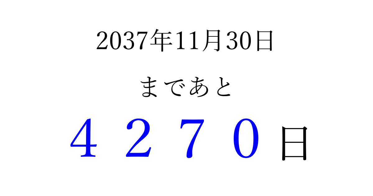 2037年11月30日(月)まで あと 9999 日です 追加すると、トップページからすぐ選べるようになります ※2026/03/23現在の結果です。 最新の状態に更新する ↓シェアして、タイムライン上にカウントダウンを表示しよう!↓ 📤 この結果を共有する Tweet シェア Threads Bluesky 別の日付でカウントダウン 2037年11月のカレンダー このページをブックマークに追加すると、いつでもカウントダウンを確認できます。 (PC: Ctrl+D / Mac: ⌘+D) hitome-notes.comでは以下のページも運営しています。 指定日と期間から日付を計算 | ガチャ確率計算・シミュレーション | プライバシー・ポリシー 運営者:Avocado