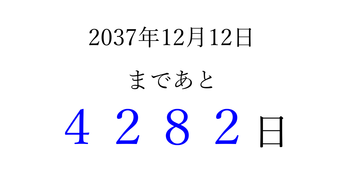 2037年12月12日(土)まで あと 9999 日です 追加すると、トップページからすぐ選べるようになります ※2026/03/23現在の結果です。 最新の状態に更新する ↓シェアして、タイムライン上にカウントダウンを表示しよう!↓ 📤 この結果を共有する Tweet シェア Threads Bluesky 別の日付でカウントダウン 2037年12月のカレンダー このページをブックマークに追加すると、いつでもカウントダウンを確認できます。 (PC: Ctrl+D / Mac: ⌘+D) hitome-notes.comでは以下のページも運営しています。 指定日と期間から日付を計算 | ガチャ確率計算・シミュレーション | プライバシー・ポリシー 運営者:Avocado