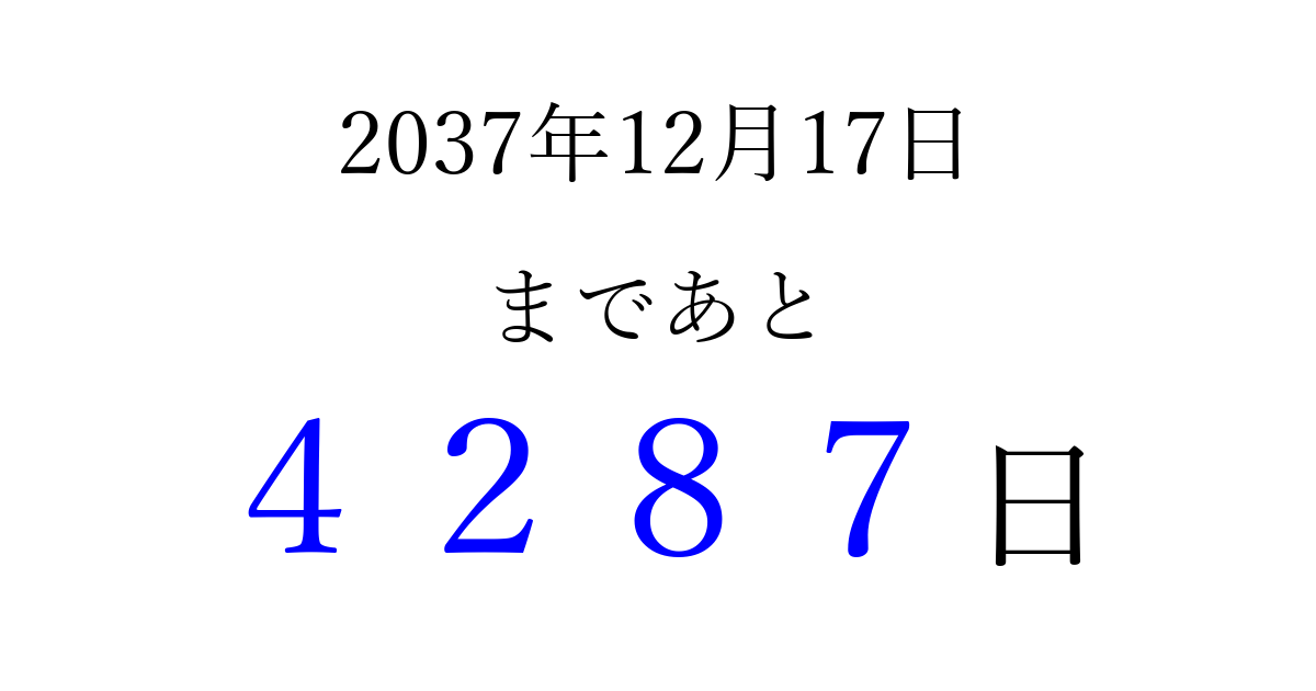 2037年12月17日(木)まで あと 9999 日です 追加すると、トップページからすぐ選べるようになります ※2026/03/23現在の結果です。 最新の状態に更新する ↓シェアして、タイムライン上にカウントダウンを表示しよう!↓ 📤 この結果を共有する Tweet シェア Threads Bluesky 別の日付でカウントダウン 2037年12月のカレンダー このページをブックマークに追加すると、いつでもカウントダウンを確認できます。 (PC: Ctrl+D / Mac: ⌘+D) hitome-notes.comでは以下のページも運営しています。 指定日と期間から日付を計算 | ガチャ確率計算・シミュレーション | プライバシー・ポリシー 運営者:Avocado