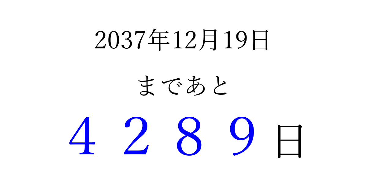 2037年12月19日(土)まで あと 9999 日です 追加すると、トップページからすぐ選べるようになります ※2026/03/23現在の結果です。 最新の状態に更新する ↓シェアして、タイムライン上にカウントダウンを表示しよう!↓ 📤 この結果を共有する Tweet シェア Threads Bluesky 別の日付でカウントダウン 2037年12月のカレンダー このページをブックマークに追加すると、いつでもカウントダウンを確認できます。 (PC: Ctrl+D / Mac: ⌘+D) hitome-notes.comでは以下のページも運営しています。 指定日と期間から日付を計算 | ガチャ確率計算・シミュレーション | プライバシー・ポリシー 運営者:Avocado