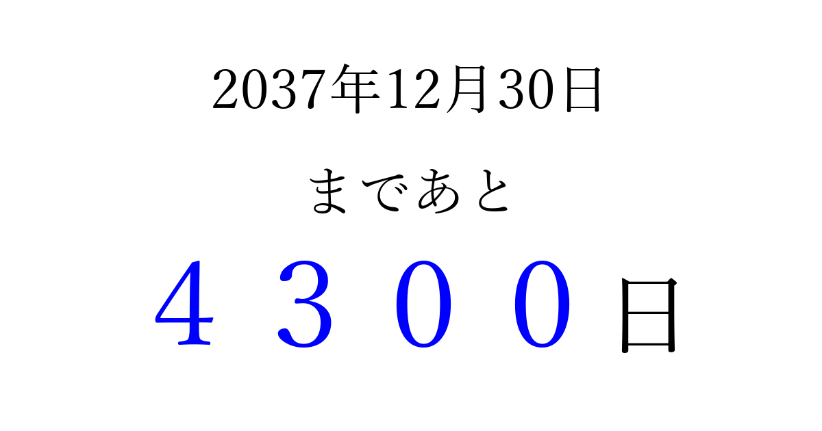 2037年12月30日(水)まで あと 9999 日です 追加すると、トップページからすぐ選べるようになります ※2026/03/23現在の結果です。 最新の状態に更新する ↓シェアして、タイムライン上にカウントダウンを表示しよう!↓ 📤 この結果を共有する Tweet シェア Threads Bluesky 別の日付でカウントダウン 2037年12月のカレンダー このページをブックマークに追加すると、いつでもカウントダウンを確認できます。 (PC: Ctrl+D / Mac: ⌘+D) hitome-notes.comでは以下のページも運営しています。 指定日と期間から日付を計算 | ガチャ確率計算・シミュレーション | プライバシー・ポリシー 運営者:Avocado