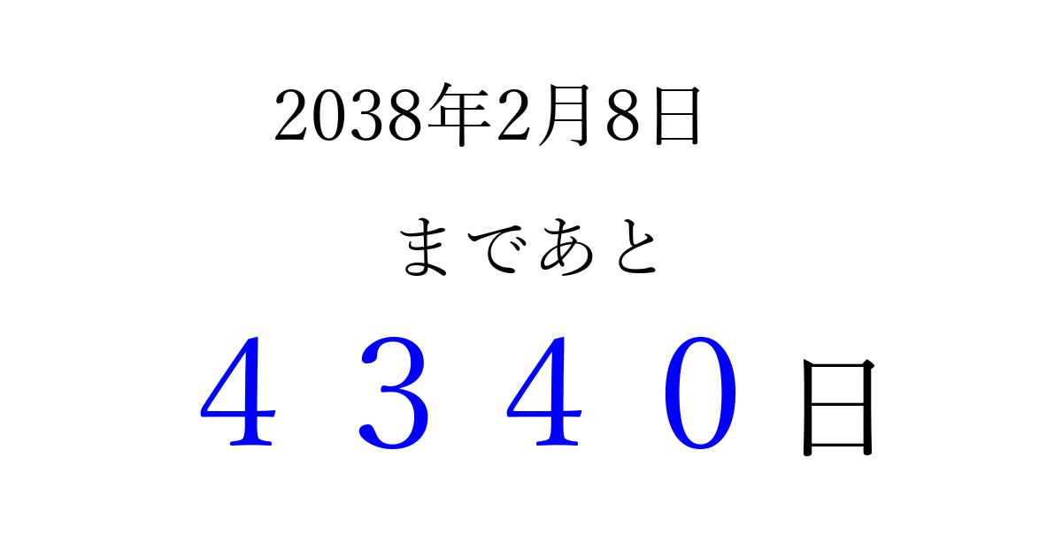 2038年2月8日(月)まで あと 9999 日です 追加すると、トップページからすぐ選べるようになります ※2026/03/23現在の結果です。 最新の状態に更新する ↓シェアして、タイムライン上にカウントダウンを表示しよう!↓ 📤 この結果を共有する Tweet シェア Threads Bluesky 別の日付でカウントダウン 2038年2月のカレンダー このページをブックマークに追加すると、いつでもカウントダウンを確認できます。 (PC: Ctrl+D / Mac: ⌘+D) hitome-notes.comでは以下のページも運営しています。 指定日と期間から日付を計算 | ガチャ確率計算・シミュレーション | プライバシー・ポリシー 運営者:Avocado