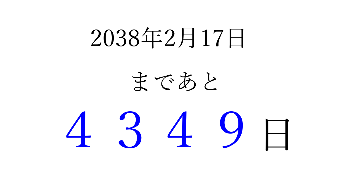 2038年2月17日(水)まで あと 9999 日です 追加すると、トップページからすぐ選べるようになります ※2026/03/23現在の結果です。 最新の状態に更新する ↓シェアして、タイムライン上にカウントダウンを表示しよう!↓ 📤 この結果を共有する Tweet シェア Threads Bluesky 別の日付でカウントダウン 2038年2月のカレンダー このページをブックマークに追加すると、いつでもカウントダウンを確認できます。 (PC: Ctrl+D / Mac: ⌘+D) hitome-notes.comでは以下のページも運営しています。 指定日と期間から日付を計算 | ガチャ確率計算・シミュレーション | プライバシー・ポリシー 運営者:Avocado