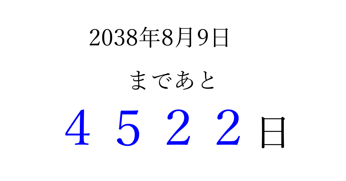 2038年8月9日(月)まで あと 9999 日です 追加すると、トップページからすぐ選べるようになります ※2026/03/23現在の結果です。 最新の状態に更新する ↓シェアして、タイムライン上にカウントダウンを表示しよう!↓ 📤 この結果を共有する Tweet シェア Threads Bluesky 別の日付でカウントダウン 2038年8月のカレンダー このページをブックマークに追加すると、いつでもカウントダウンを確認できます。 (PC: Ctrl+D / Mac: ⌘+D) hitome-notes.comでは以下のページも運営しています。 指定日と期間から日付を計算 | ガチャ確率計算・シミュレーション | プライバシー・ポリシー 運営者:Avocado