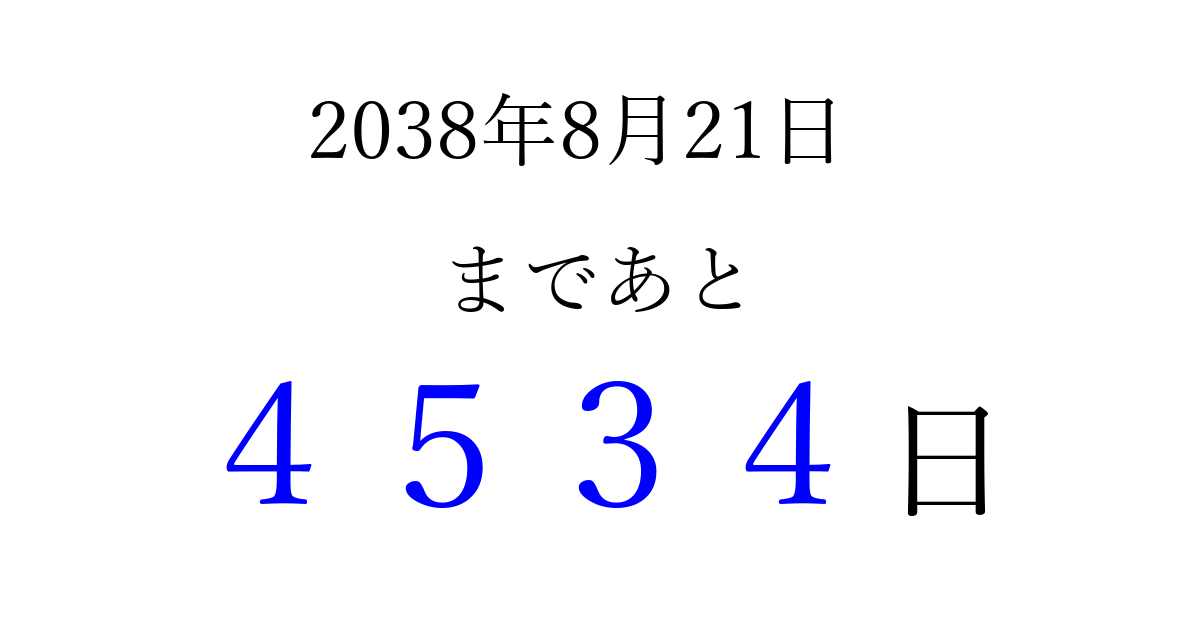 2038年8月21日(土)まで あと 9999 日です 追加すると、トップページからすぐ選べるようになります ※2026/03/23現在の結果です。 最新の状態に更新する ↓シェアして、タイムライン上にカウントダウンを表示しよう!↓ 📤 この結果を共有する Tweet シェア Threads Bluesky 別の日付でカウントダウン 2038年8月のカレンダー このページをブックマークに追加すると、いつでもカウントダウンを確認できます。 (PC: Ctrl+D / Mac: ⌘+D) hitome-notes.comでは以下のページも運営しています。 指定日と期間から日付を計算 | ガチャ確率計算・シミュレーション | プライバシー・ポリシー 運営者:Avocado
