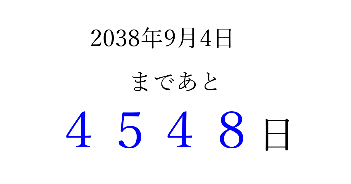 2038年9月4日(土)まで あと 9999 日です 追加すると、トップページからすぐ選べるようになります ※2026/03/23現在の結果です。 最新の状態に更新する ↓シェアして、タイムライン上にカウントダウンを表示しよう!↓ 📤 この結果を共有する Tweet シェア Threads Bluesky 別の日付でカウントダウン 2038年9月のカレンダー このページをブックマークに追加すると、いつでもカウントダウンを確認できます。 (PC: Ctrl+D / Mac: ⌘+D) hitome-notes.comでは以下のページも運営しています。 指定日と期間から日付を計算 | ガチャ確率計算・シミュレーション | プライバシー・ポリシー 運営者:Avocado