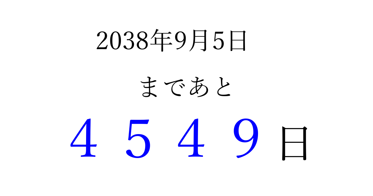 2038年9月5日(日)まで あと 9999 日です 追加すると、トップページからすぐ選べるようになります ※2026/03/23現在の結果です。 最新の状態に更新する ↓シェアして、タイムライン上にカウントダウンを表示しよう!↓ 📤 この結果を共有する Tweet シェア Threads Bluesky 別の日付でカウントダウン 2038年9月のカレンダー このページをブックマークに追加すると、いつでもカウントダウンを確認できます。 (PC: Ctrl+D / Mac: ⌘+D) hitome-notes.comでは以下のページも運営しています。 指定日と期間から日付を計算 | ガチャ確率計算・シミュレーション | プライバシー・ポリシー 運営者:Avocado