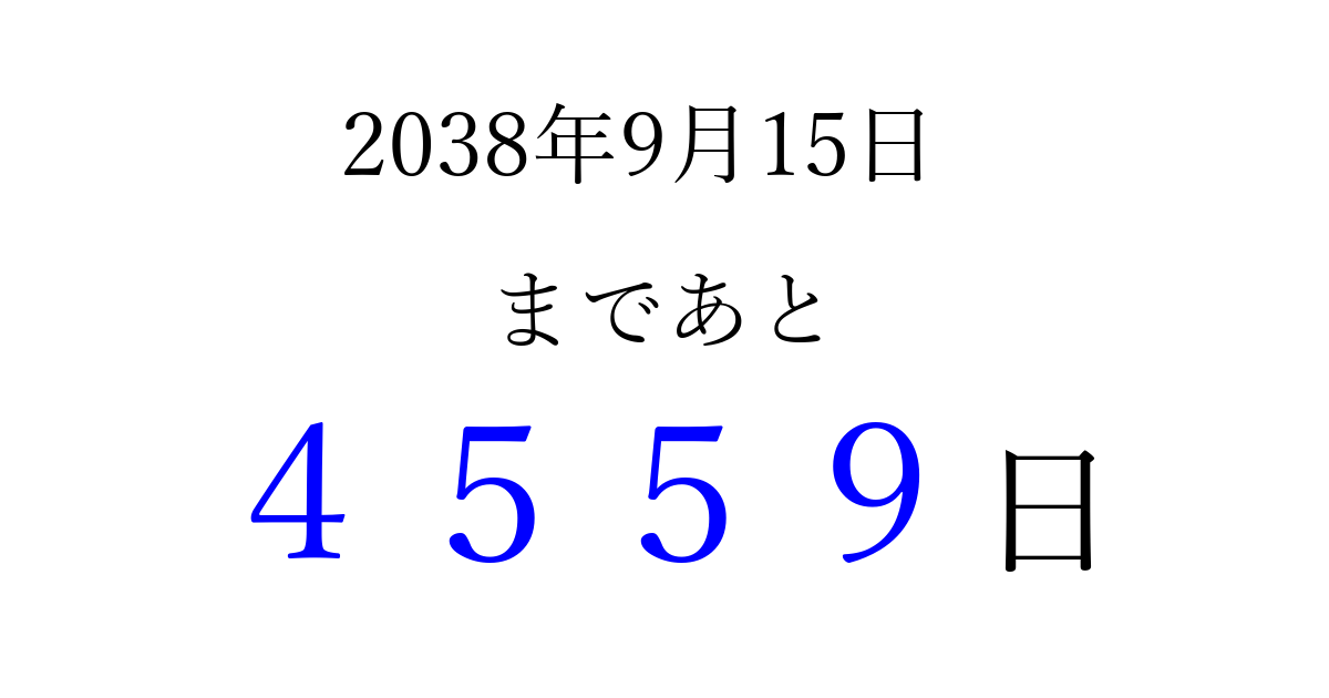 2038年9月15日(水)まで あと 9999 日です 追加すると、トップページからすぐ選べるようになります ※2026/03/23現在の結果です。 最新の状態に更新する ↓シェアして、タイムライン上にカウントダウンを表示しよう!↓ 📤 この結果を共有する Tweet シェア Threads Bluesky 別の日付でカウントダウン 2038年9月のカレンダー このページをブックマークに追加すると、いつでもカウントダウンを確認できます。 (PC: Ctrl+D / Mac: ⌘+D) hitome-notes.comでは以下のページも運営しています。 指定日と期間から日付を計算 | ガチャ確率計算・シミュレーション | プライバシー・ポリシー 運営者:Avocado
