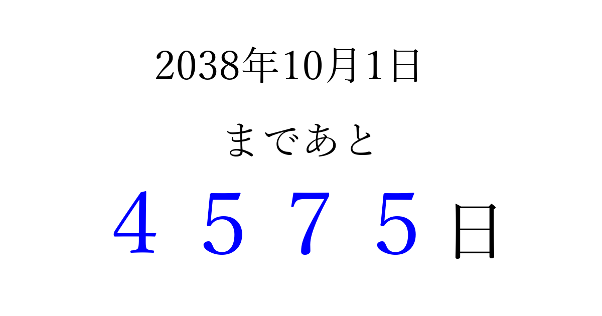 2038年10月1日(金)まで あと 9999 日です 追加すると、トップページからすぐ選べるようになります ※2026/03/23現在の結果です。 最新の状態に更新する ↓シェアして、タイムライン上にカウントダウンを表示しよう!↓ 📤 この結果を共有する Tweet シェア Threads Bluesky 別の日付でカウントダウン 2038年10月のカレンダー このページをブックマークに追加すると、いつでもカウントダウンを確認できます。 (PC: Ctrl+D / Mac: ⌘+D) hitome-notes.comでは以下のページも運営しています。 指定日と期間から日付を計算 | ガチャ確率計算・シミュレーション | プライバシー・ポリシー 運営者:Avocado