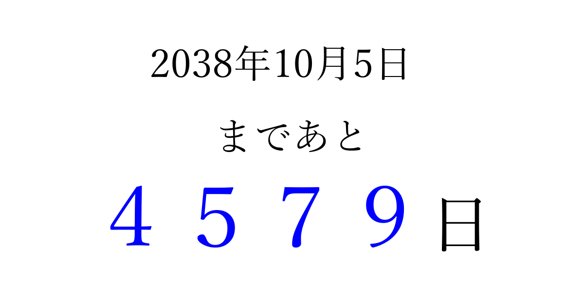 2038年10月5日(火)まで あと 9999 日です 追加すると、トップページからすぐ選べるようになります ※2026/03/23現在の結果です。 最新の状態に更新する ↓シェアして、タイムライン上にカウントダウンを表示しよう!↓ 📤 この結果を共有する Tweet シェア Threads Bluesky 別の日付でカウントダウン 2038年10月のカレンダー このページをブックマークに追加すると、いつでもカウントダウンを確認できます。 (PC: Ctrl+D / Mac: ⌘+D) hitome-notes.comでは以下のページも運営しています。 指定日と期間から日付を計算 | ガチャ確率計算・シミュレーション | プライバシー・ポリシー 運営者:Avocado