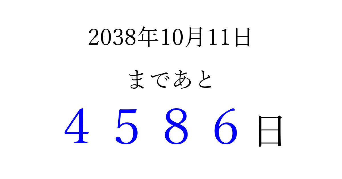 2038年10月11日(月)まで あと 9999 日です 追加すると、トップページからすぐ選べるようになります ※2026/03/22現在の結果です。 最新の状態に更新する ↓シェアして、タイムライン上にカウントダウンを表示しよう!↓ 📤 この結果を共有する Tweet シェア Threads Bluesky 別の日付でカウントダウン 2038年10月のカレンダー このページをブックマークに追加すると、いつでもカウントダウンを確認できます。 (PC: Ctrl+D / Mac: ⌘+D) hitome-notes.comでは以下のページも運営しています。 指定日と期間から日付を計算 | ガチャ確率計算・シミュレーション | プライバシー・ポリシー 運営者:Avocado