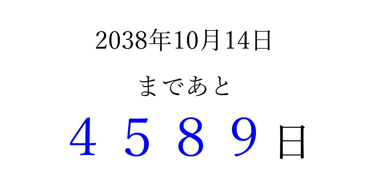2038年10月14日(木)まで あと 9999 日です 追加すると、トップページからすぐ選べるようになります ※2026/03/22現在の結果です。 最新の状態に更新する ↓シェアして、タイムライン上にカウントダウンを表示しよう!↓ 📤 この結果を共有する Tweet シェア Threads Bluesky 別の日付でカウントダウン 2038年10月のカレンダー このページをブックマークに追加すると、いつでもカウントダウンを確認できます。 (PC: Ctrl+D / Mac: ⌘+D) hitome-notes.comでは以下のページも運営しています。 指定日と期間から日付を計算 | ガチャ確率計算・シミュレーション | プライバシー・ポリシー 運営者:Avocado