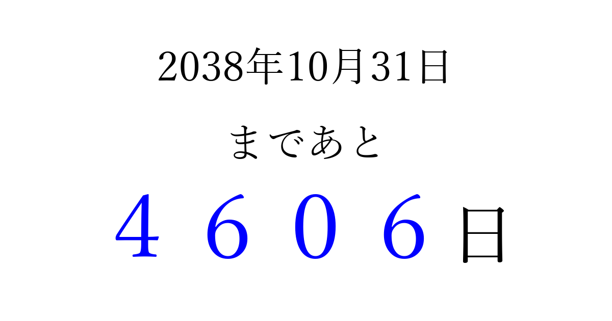 2038年10月31日(日)まで あと 9999 日です 追加すると、トップページからすぐ選べるようになります ※2026/03/22現在の結果です。 最新の状態に更新する ↓シェアして、タイムライン上にカウントダウンを表示しよう!↓ 📤 この結果を共有する Tweet シェア Threads Bluesky 別の日付でカウントダウン 2038年10月のカレンダー このページをブックマークに追加すると、いつでもカウントダウンを確認できます。 (PC: Ctrl+D / Mac: ⌘+D) hitome-notes.comでは以下のページも運営しています。 指定日と期間から日付を計算 | ガチャ確率計算・シミュレーション | プライバシー・ポリシー 運営者:Avocado