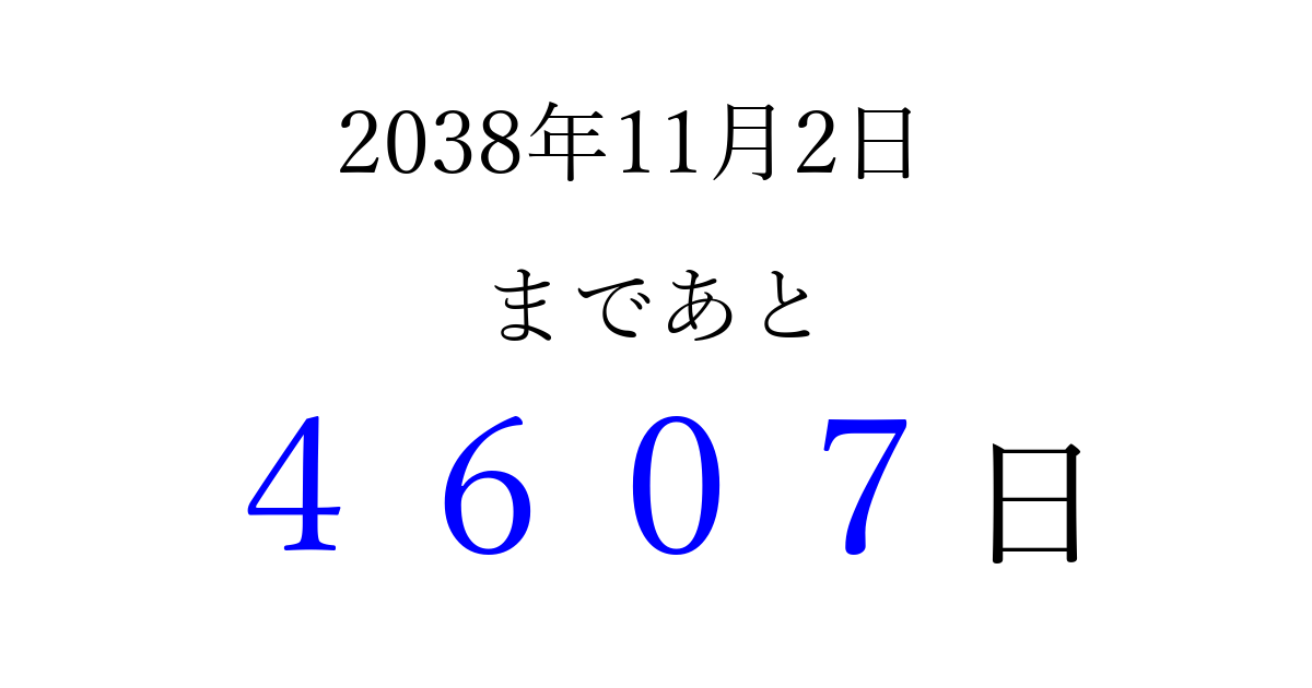 2038年11月2日(火)まで あと 9999 日です 追加すると、トップページからすぐ選べるようになります ※2026/03/23現在の結果です。 最新の状態に更新する ↓シェアして、タイムライン上にカウントダウンを表示しよう!↓ 📤 この結果を共有する Tweet シェア Threads Bluesky 別の日付でカウントダウン 2038年11月のカレンダー このページをブックマークに追加すると、いつでもカウントダウンを確認できます。 (PC: Ctrl+D / Mac: ⌘+D) hitome-notes.comでは以下のページも運営しています。 指定日と期間から日付を計算 | ガチャ確率計算・シミュレーション | プライバシー・ポリシー 運営者:Avocado