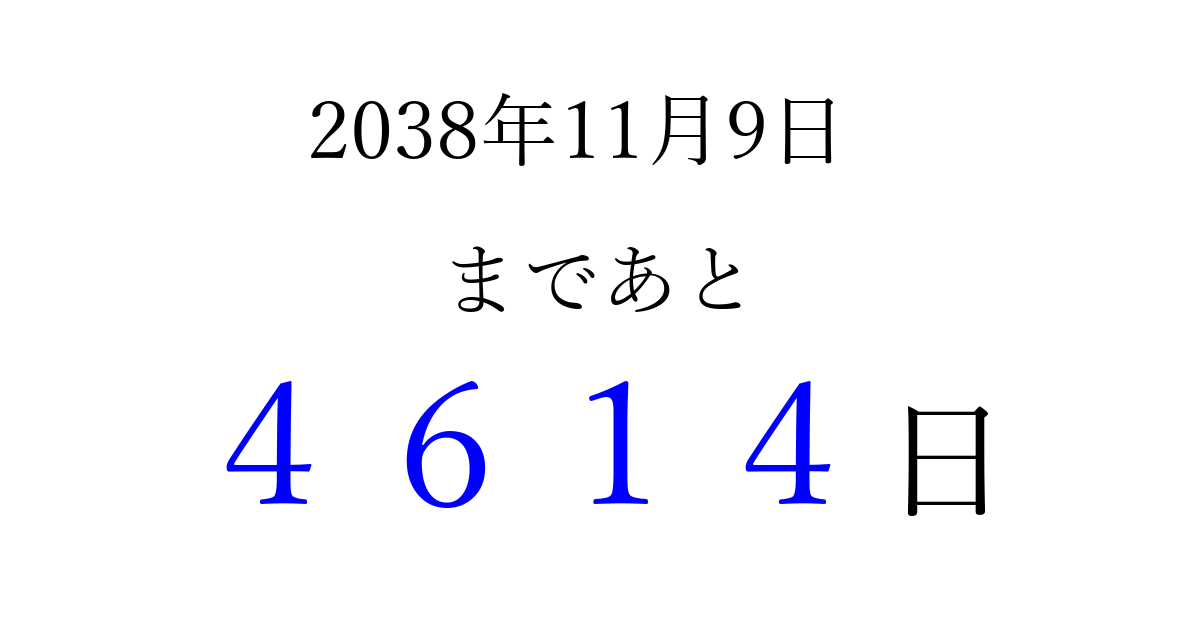 2038年11月9日(火)まで あと 9999 日です 追加すると、トップページからすぐ選べるようになります ※2026/03/23現在の結果です。 最新の状態に更新する ↓シェアして、タイムライン上にカウントダウンを表示しよう!↓ 📤 この結果を共有する Tweet シェア Threads Bluesky 別の日付でカウントダウン 2038年11月のカレンダー このページをブックマークに追加すると、いつでもカウントダウンを確認できます。 (PC: Ctrl+D / Mac: ⌘+D) hitome-notes.comでは以下のページも運営しています。 指定日と期間から日付を計算 | ガチャ確率計算・シミュレーション | プライバシー・ポリシー 運営者:Avocado