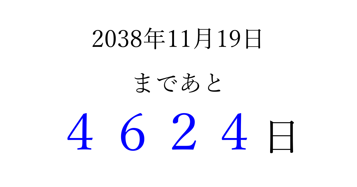 2038年11月19日(金)まで あと 9999 日です 追加すると、トップページからすぐ選べるようになります ※2026/03/23現在の結果です。 最新の状態に更新する ↓シェアして、タイムライン上にカウントダウンを表示しよう!↓ 📤 この結果を共有する Tweet シェア Threads Bluesky 別の日付でカウントダウン 2038年11月のカレンダー このページをブックマークに追加すると、いつでもカウントダウンを確認できます。 (PC: Ctrl+D / Mac: ⌘+D) hitome-notes.comでは以下のページも運営しています。 指定日と期間から日付を計算 | ガチャ確率計算・シミュレーション | プライバシー・ポリシー 運営者:Avocado