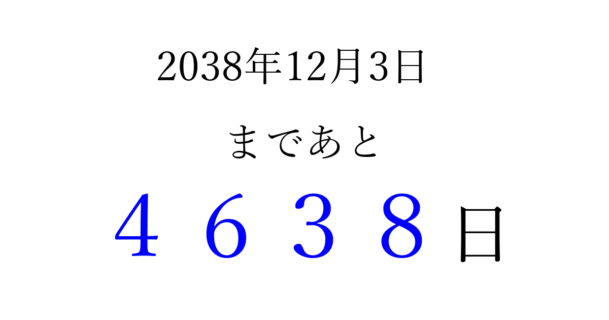 2038年12月3日(金)まで あと 9999 日です 追加すると、トップページからすぐ選べるようになります ※2026/03/23現在の結果です。 最新の状態に更新する ↓シェアして、タイムライン上にカウントダウンを表示しよう!↓ 📤 この結果を共有する Tweet シェア Threads Bluesky 別の日付でカウントダウン 2038年12月のカレンダー このページをブックマークに追加すると、いつでもカウントダウンを確認できます。 (PC: Ctrl+D / Mac: ⌘+D) hitome-notes.comでは以下のページも運営しています。 指定日と期間から日付を計算 | ガチャ確率計算・シミュレーション | プライバシー・ポリシー 運営者:Avocado