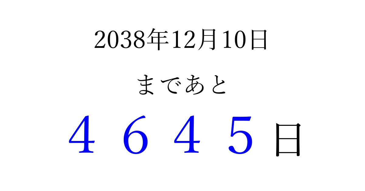 2038年12月10日(金)まで あと 9999 日です 追加すると、トップページからすぐ選べるようになります ※2026/03/23現在の結果です。 最新の状態に更新する ↓シェアして、タイムライン上にカウントダウンを表示しよう!↓ 📤 この結果を共有する Tweet シェア Threads Bluesky 別の日付でカウントダウン 2038年12月のカレンダー このページをブックマークに追加すると、いつでもカウントダウンを確認できます。 (PC: Ctrl+D / Mac: ⌘+D) hitome-notes.comでは以下のページも運営しています。 指定日と期間から日付を計算 | ガチャ確率計算・シミュレーション | プライバシー・ポリシー 運営者:Avocado