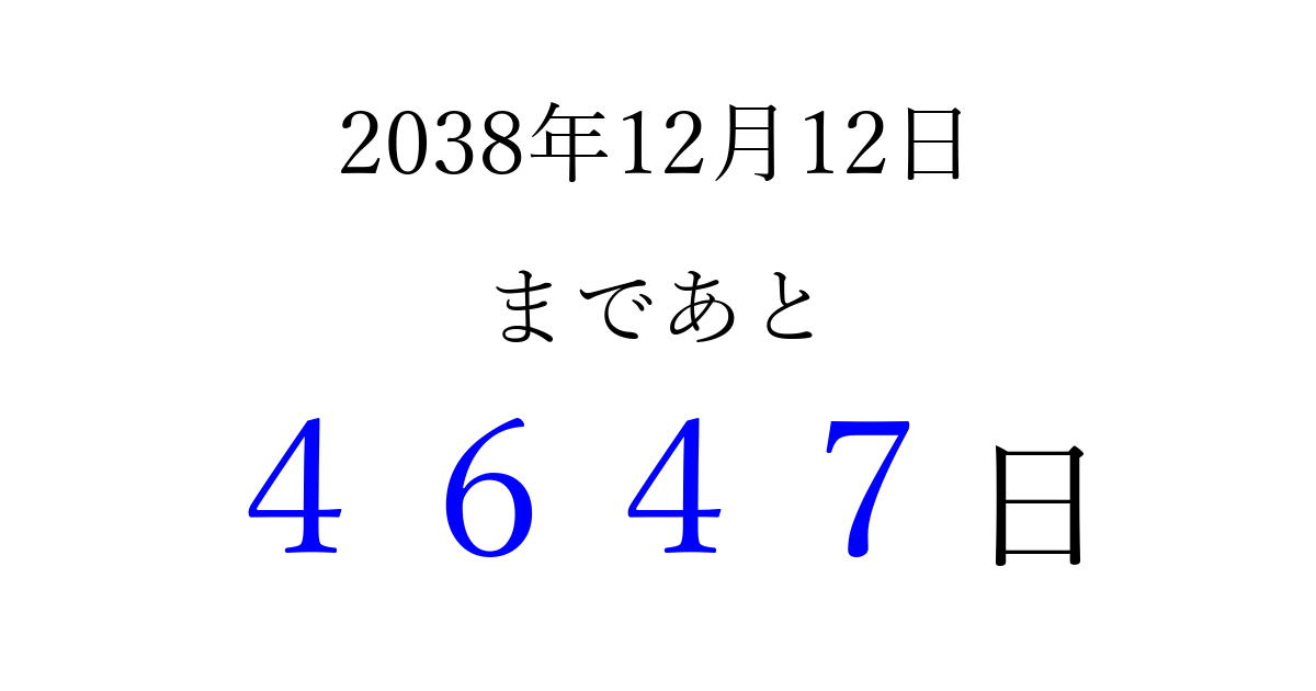 2038年12月12日(日)まで あと 9999 日です 追加すると、トップページからすぐ選べるようになります ※2026/03/23現在の結果です。 最新の状態に更新する ↓シェアして、タイムライン上にカウントダウンを表示しよう!↓ 📤 この結果を共有する Tweet シェア Threads Bluesky 別の日付でカウントダウン 2038年12月のカレンダー このページをブックマークに追加すると、いつでもカウントダウンを確認できます。 (PC: Ctrl+D / Mac: ⌘+D) hitome-notes.comでは以下のページも運営しています。 指定日と期間から日付を計算 | ガチャ確率計算・シミュレーション | プライバシー・ポリシー 運営者:Avocado