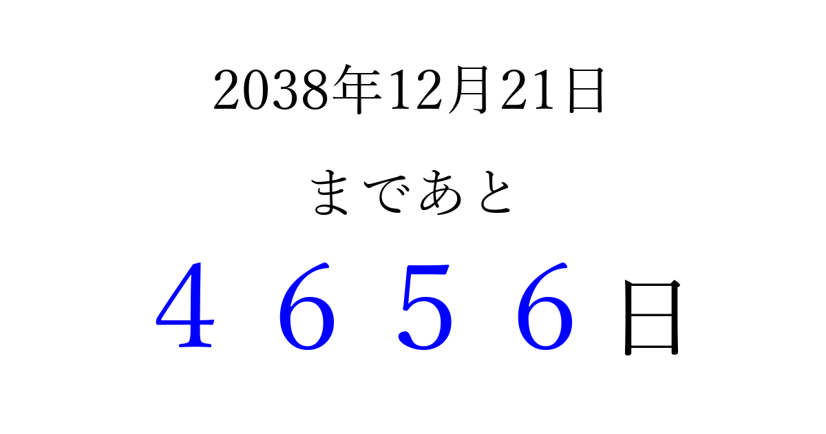 2038年12月21日(火)まで あと 9999 日です 追加すると、トップページからすぐ選べるようになります ※2026/03/23現在の結果です。 最新の状態に更新する ↓シェアして、タイムライン上にカウントダウンを表示しよう!↓ 📤 この結果を共有する Tweet シェア Threads Bluesky 別の日付でカウントダウン 2038年12月のカレンダー このページをブックマークに追加すると、いつでもカウントダウンを確認できます。 (PC: Ctrl+D / Mac: ⌘+D) hitome-notes.comでは以下のページも運営しています。 指定日と期間から日付を計算 | ガチャ確率計算・シミュレーション | プライバシー・ポリシー 運営者:Avocado