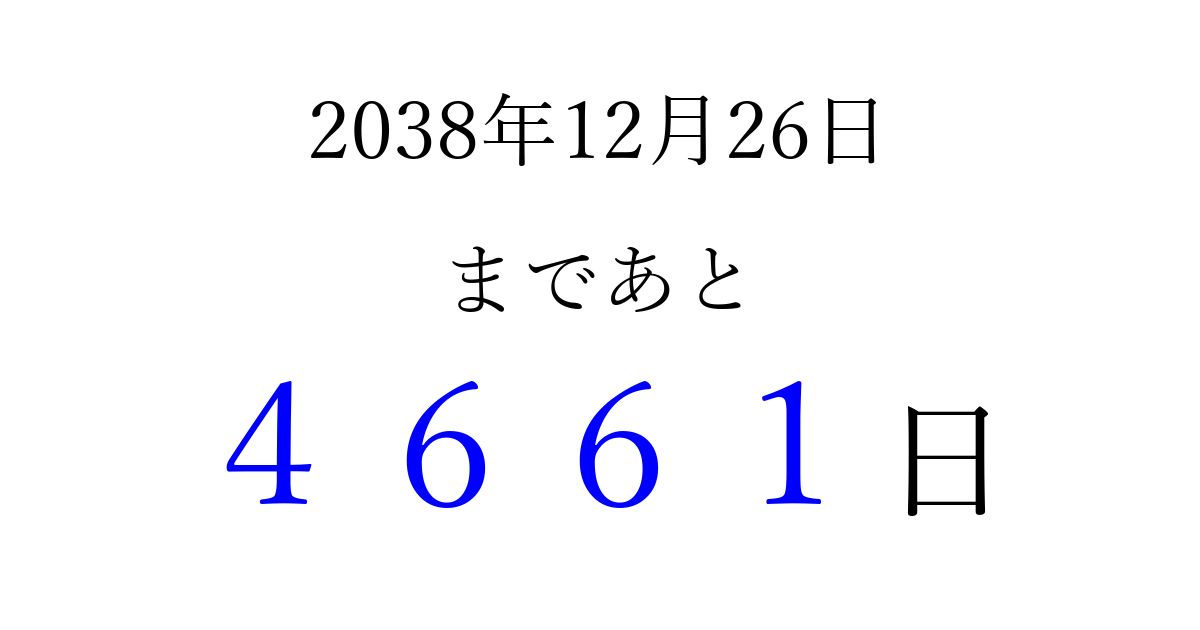 2038年12月26日(日)まで あと 9999 日です 追加すると、トップページからすぐ選べるようになります ※2026/03/23現在の結果です。 最新の状態に更新する ↓シェアして、タイムライン上にカウントダウンを表示しよう!↓ 📤 この結果を共有する Tweet シェア Threads Bluesky 別の日付でカウントダウン 2038年12月のカレンダー このページをブックマークに追加すると、いつでもカウントダウンを確認できます。 (PC: Ctrl+D / Mac: ⌘+D) hitome-notes.comでは以下のページも運営しています。 指定日と期間から日付を計算 | ガチャ確率計算・シミュレーション | プライバシー・ポリシー 運営者:Avocado