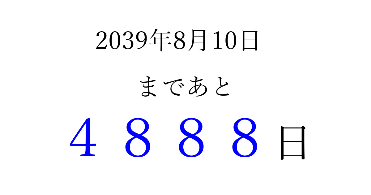 2039年8月10日(水)まで あと 9999 日です 追加すると、トップページからすぐ選べるようになります ※2026/03/23現在の結果です。 最新の状態に更新する ↓シェアして、タイムライン上にカウントダウンを表示しよう!↓ 📤 この結果を共有する Tweet シェア Threads Bluesky 別の日付でカウントダウン 2039年8月のカレンダー このページをブックマークに追加すると、いつでもカウントダウンを確認できます。 (PC: Ctrl+D / Mac: ⌘+D) hitome-notes.comでは以下のページも運営しています。 指定日と期間から日付を計算 | ガチャ確率計算・シミュレーション | プライバシー・ポリシー 運営者:Avocado