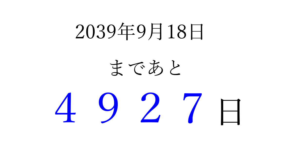 2039年9月18日(日)まで あと 9999 日です 追加すると、トップページからすぐ選べるようになります ※2026/03/23現在の結果です。 最新の状態に更新する ↓シェアして、タイムライン上にカウントダウンを表示しよう!↓ 📤 この結果を共有する Tweet シェア Threads Bluesky 別の日付でカウントダウン 2039年9月のカレンダー このページをブックマークに追加すると、いつでもカウントダウンを確認できます。 (PC: Ctrl+D / Mac: ⌘+D) hitome-notes.comでは以下のページも運営しています。 指定日と期間から日付を計算 | ガチャ確率計算・シミュレーション | プライバシー・ポリシー 運営者:Avocado