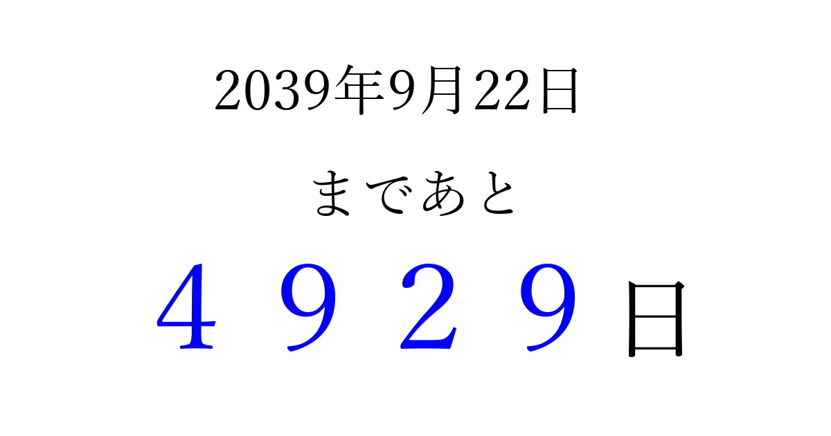 2039年9月22日(木)まで あと 9999 日です 追加すると、トップページからすぐ選べるようになります ※2026/03/25現在の結果です。 最新の状態に更新する ↓シェアして、タイムライン上にカウントダウンを表示しよう!↓ 📤 この結果を共有する Tweet シェア Threads Bluesky 別の日付でカウントダウン 2039年9月のカレンダー このページをブックマークに追加すると、いつでもカウントダウンを確認できます。 (PC: Ctrl+D / Mac: ⌘+D) hitome-notes.comでは以下のページも運営しています。 指定日と期間から日付を計算 | ガチャ確率計算・シミュレーション | プライバシー・ポリシー 運営者:Avocado