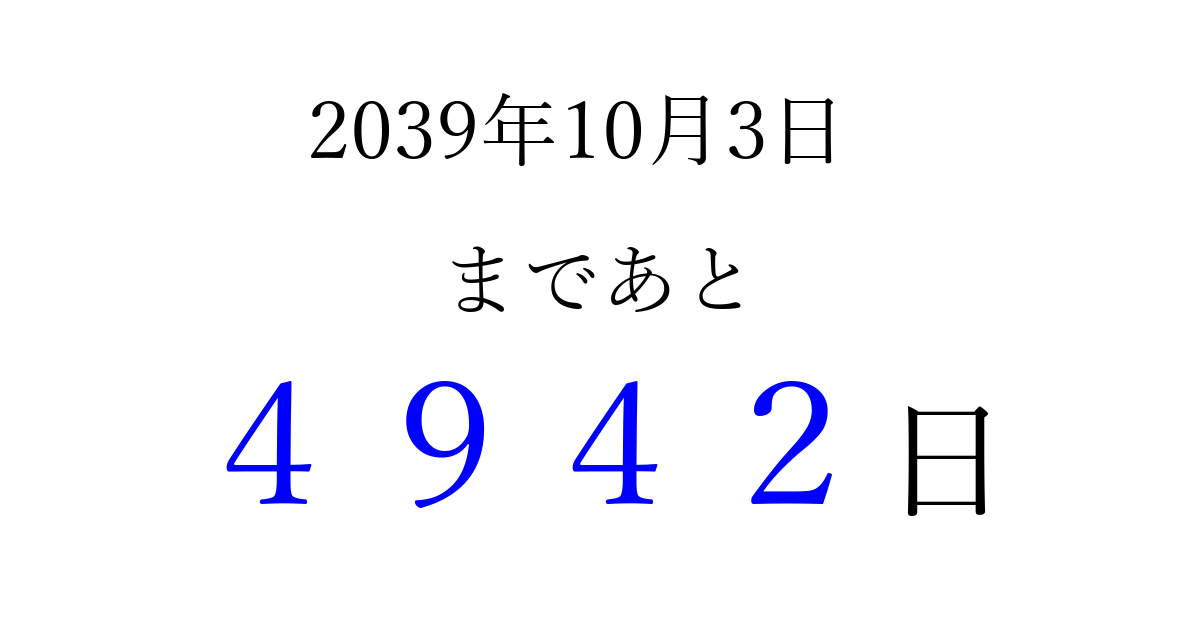 2039年10月3日(月)まで あと 9999 日です 追加すると、トップページからすぐ選べるようになります ※2026/03/23現在の結果です。 最新の状態に更新する ↓シェアして、タイムライン上にカウントダウンを表示しよう!↓ 📤 この結果を共有する Tweet シェア Threads Bluesky 別の日付でカウントダウン 2039年10月のカレンダー このページをブックマークに追加すると、いつでもカウントダウンを確認できます。 (PC: Ctrl+D / Mac: ⌘+D) hitome-notes.comでは以下のページも運営しています。 指定日と期間から日付を計算 | ガチャ確率計算・シミュレーション | プライバシー・ポリシー 運営者:Avocado