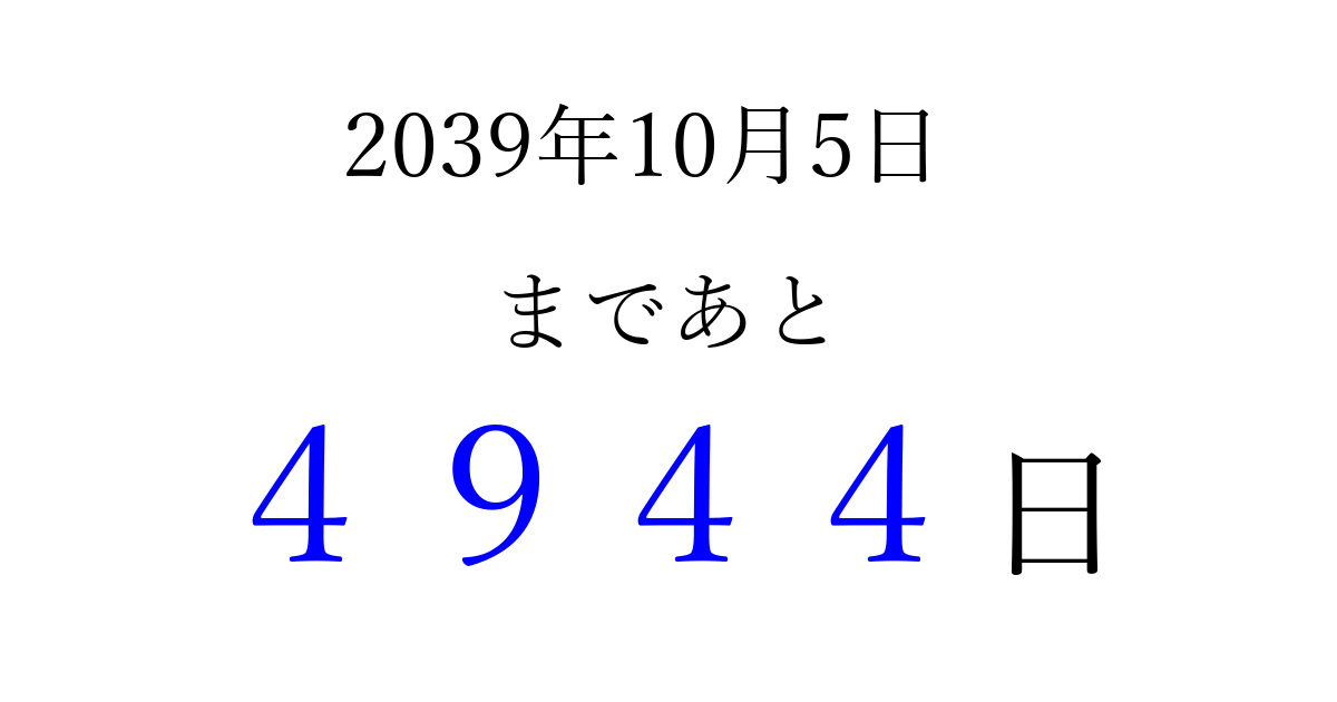 2039年10月5日(水)まで あと 9999 日です 追加すると、トップページからすぐ選べるようになります ※2026/03/23現在の結果です。 最新の状態に更新する ↓シェアして、タイムライン上にカウントダウンを表示しよう!↓ 📤 この結果を共有する Tweet シェア Threads Bluesky 別の日付でカウントダウン 2039年10月のカレンダー このページをブックマークに追加すると、いつでもカウントダウンを確認できます。 (PC: Ctrl+D / Mac: ⌘+D) hitome-notes.comでは以下のページも運営しています。 指定日と期間から日付を計算 | ガチャ確率計算・シミュレーション | プライバシー・ポリシー 運営者:Avocado