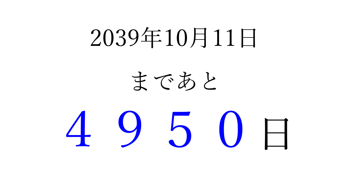 2039年10月11日(火)まで あと 9999 日です 追加すると、トップページからすぐ選べるようになります ※2026/03/23現在の結果です。 最新の状態に更新する ↓シェアして、タイムライン上にカウントダウンを表示しよう!↓ 📤 この結果を共有する Tweet シェア Threads Bluesky 別の日付でカウントダウン 2039年10月のカレンダー このページをブックマークに追加すると、いつでもカウントダウンを確認できます。 (PC: Ctrl+D / Mac: ⌘+D) hitome-notes.comでは以下のページも運営しています。 指定日と期間から日付を計算 | ガチャ確率計算・シミュレーション | プライバシー・ポリシー 運営者:Avocado