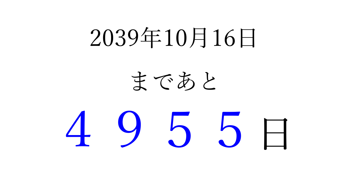 2039年10月16日(日)まで あと 9999 日です 追加すると、トップページからすぐ選べるようになります ※2026/03/23現在の結果です。 最新の状態に更新する ↓シェアして、タイムライン上にカウントダウンを表示しよう!↓ 📤 この結果を共有する Tweet シェア Threads Bluesky 別の日付でカウントダウン 2039年10月のカレンダー このページをブックマークに追加すると、いつでもカウントダウンを確認できます。 (PC: Ctrl+D / Mac: ⌘+D) hitome-notes.comでは以下のページも運営しています。 指定日と期間から日付を計算 | ガチャ確率計算・シミュレーション | プライバシー・ポリシー 運営者:Avocado