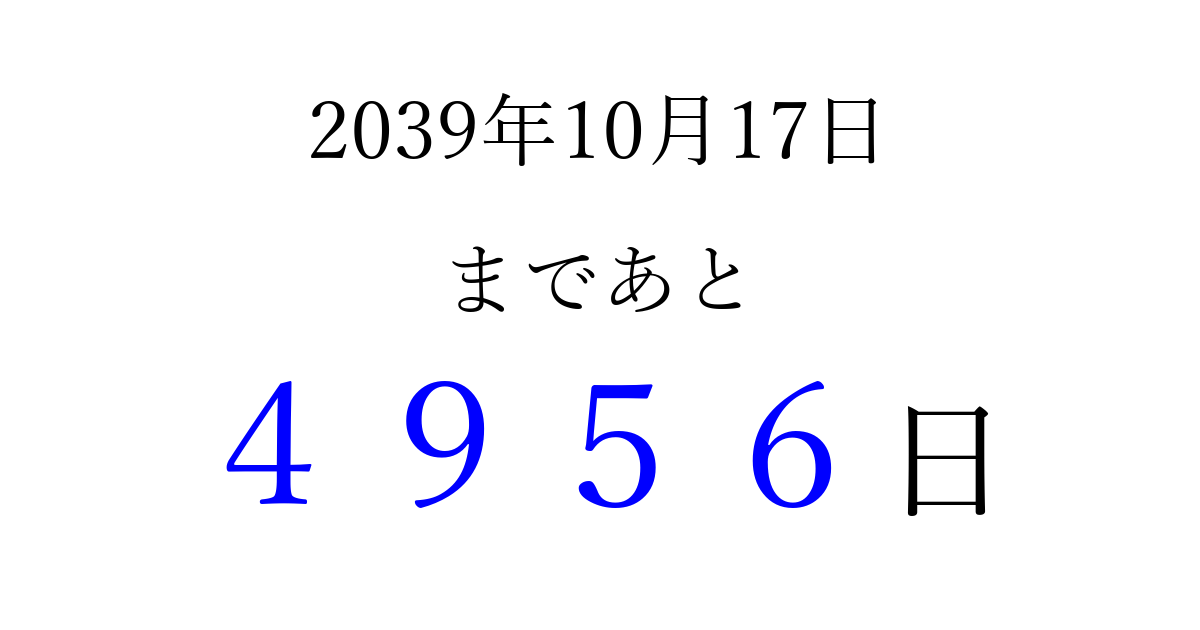 2039年10月17日(月)まで あと 9999 日です 追加すると、トップページからすぐ選べるようになります ※2026/03/23現在の結果です。 最新の状態に更新する ↓シェアして、タイムライン上にカウントダウンを表示しよう!↓ 📤 この結果を共有する Tweet シェア Threads Bluesky 別の日付でカウントダウン 2039年10月のカレンダー このページをブックマークに追加すると、いつでもカウントダウンを確認できます。 (PC: Ctrl+D / Mac: ⌘+D) hitome-notes.comでは以下のページも運営しています。 指定日と期間から日付を計算 | ガチャ確率計算・シミュレーション | プライバシー・ポリシー 運営者:Avocado