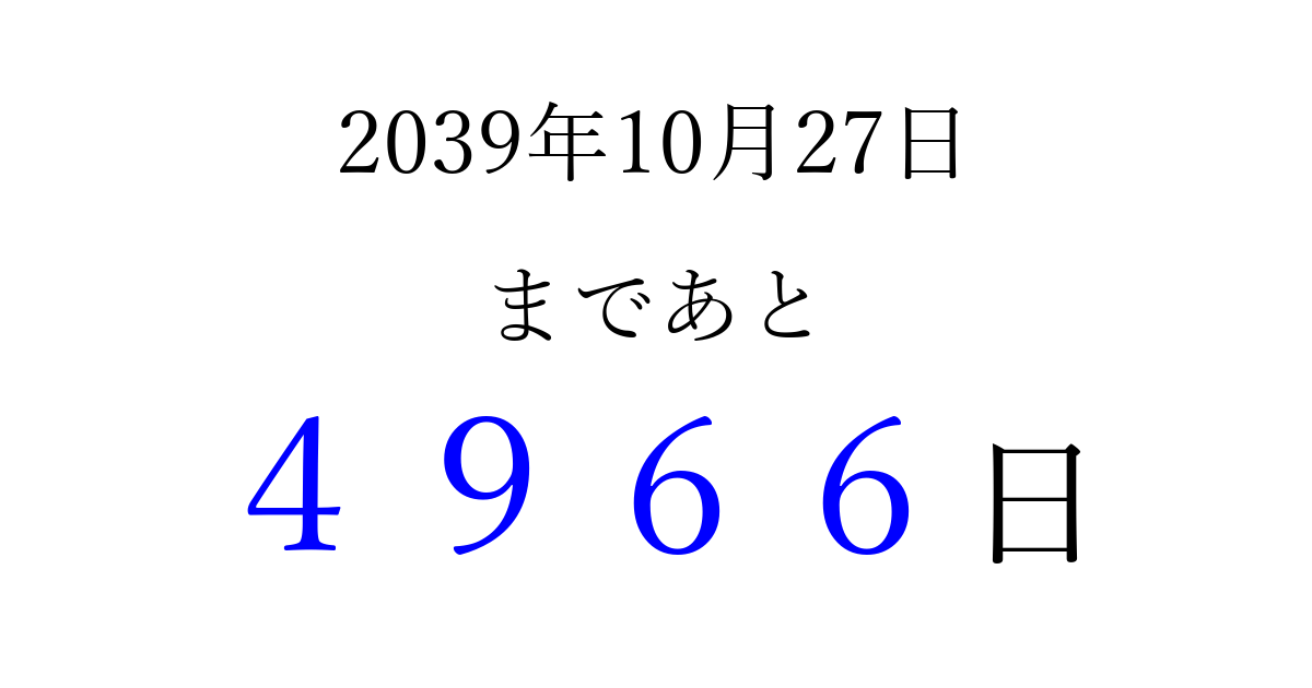 2039年10月27日(木)まで あと 9999 日です 追加すると、トップページからすぐ選べるようになります ※2026/03/23現在の結果です。 最新の状態に更新する ↓シェアして、タイムライン上にカウントダウンを表示しよう!↓ 📤 この結果を共有する Tweet シェア Threads Bluesky 別の日付でカウントダウン 2039年10月のカレンダー このページをブックマークに追加すると、いつでもカウントダウンを確認できます。 (PC: Ctrl+D / Mac: ⌘+D) hitome-notes.comでは以下のページも運営しています。 指定日と期間から日付を計算 | ガチャ確率計算・シミュレーション | プライバシー・ポリシー 運営者:Avocado