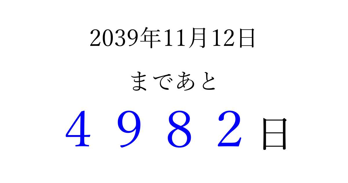 2039年11月12日(土)まで あと 9999 日です 追加すると、トップページからすぐ選べるようになります ※2026/03/23現在の結果です。 最新の状態に更新する ↓シェアして、タイムライン上にカウントダウンを表示しよう!↓ 📤 この結果を共有する Tweet シェア Threads Bluesky 別の日付でカウントダウン 2039年11月のカレンダー このページをブックマークに追加すると、いつでもカウントダウンを確認できます。 (PC: Ctrl+D / Mac: ⌘+D) hitome-notes.comでは以下のページも運営しています。 指定日と期間から日付を計算 | ガチャ確率計算・シミュレーション | プライバシー・ポリシー 運営者:Avocado