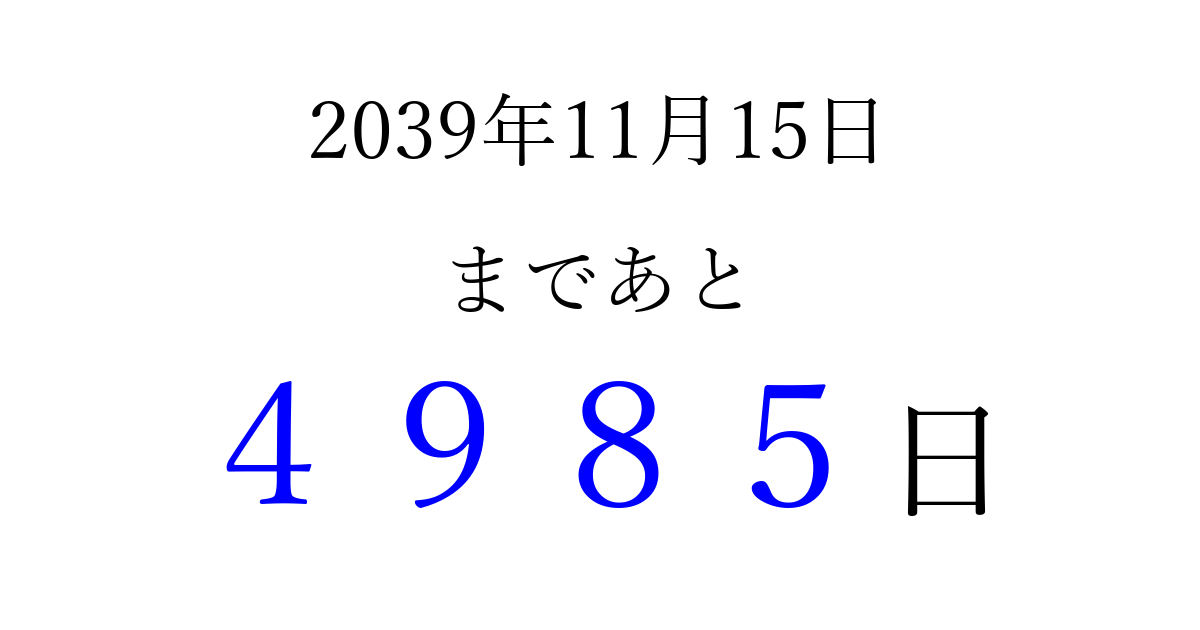 2039年11月15日(火)まで あと 9999 日です 追加すると、トップページからすぐ選べるようになります ※2026/03/23現在の結果です。 最新の状態に更新する ↓シェアして、タイムライン上にカウントダウンを表示しよう!↓ 📤 この結果を共有する Tweet シェア Threads Bluesky 別の日付でカウントダウン 2039年11月のカレンダー このページをブックマークに追加すると、いつでもカウントダウンを確認できます。 (PC: Ctrl+D / Mac: ⌘+D) hitome-notes.comでは以下のページも運営しています。 指定日と期間から日付を計算 | ガチャ確率計算・シミュレーション | プライバシー・ポリシー 運営者:Avocado