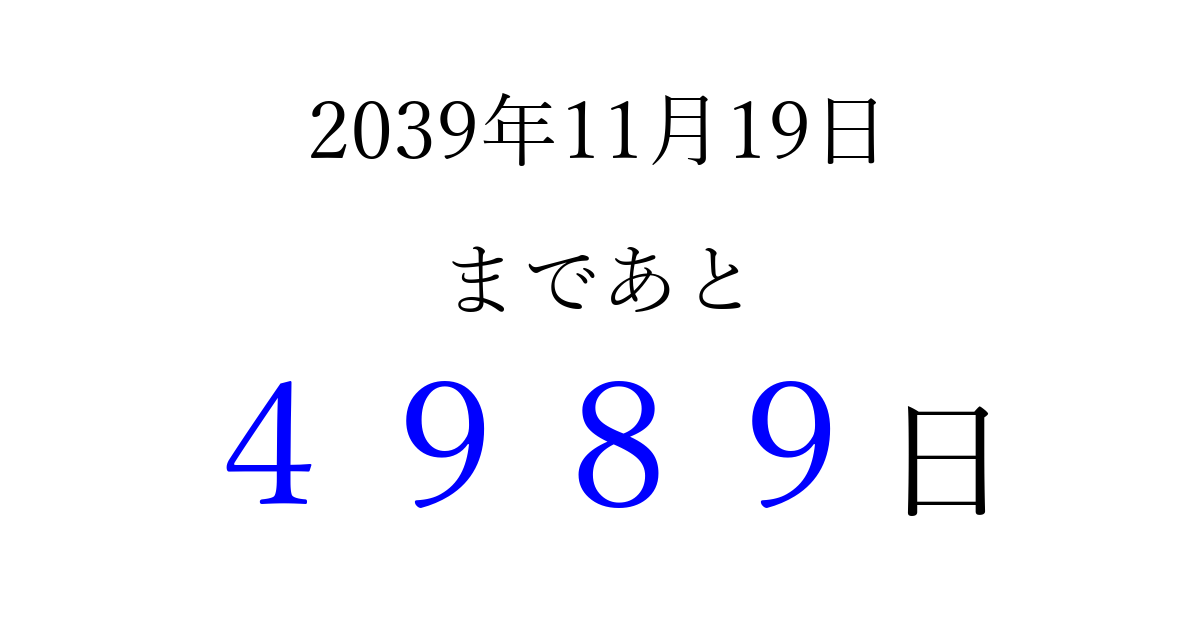 2039年11月19日(土)まで あと 9999 日です 追加すると、トップページからすぐ選べるようになります ※2026/03/23現在の結果です。 最新の状態に更新する ↓シェアして、タイムライン上にカウントダウンを表示しよう!↓ 📤 この結果を共有する Tweet シェア Threads Bluesky 別の日付でカウントダウン 2039年11月のカレンダー このページをブックマークに追加すると、いつでもカウントダウンを確認できます。 (PC: Ctrl+D / Mac: ⌘+D) hitome-notes.comでは以下のページも運営しています。 指定日と期間から日付を計算 | ガチャ確率計算・シミュレーション | プライバシー・ポリシー 運営者:Avocado