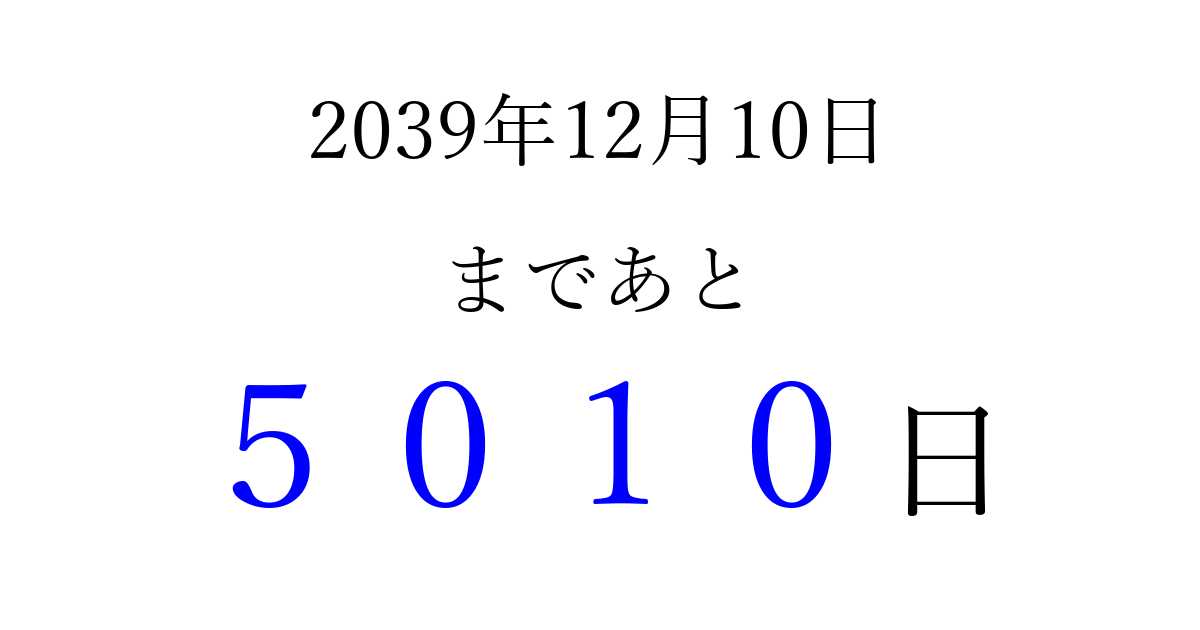 2039年12月10日(土)まで あと 9999 日です 追加すると、トップページからすぐ選べるようになります ※2026/03/23現在の結果です。 最新の状態に更新する ↓シェアして、タイムライン上にカウントダウンを表示しよう!↓ 📤 この結果を共有する Tweet シェア Threads Bluesky 別の日付でカウントダウン 2039年12月のカレンダー このページをブックマークに追加すると、いつでもカウントダウンを確認できます。 (PC: Ctrl+D / Mac: ⌘+D) hitome-notes.comでは以下のページも運営しています。 指定日と期間から日付を計算 | ガチャ確率計算・シミュレーション | プライバシー・ポリシー 運営者:Avocado