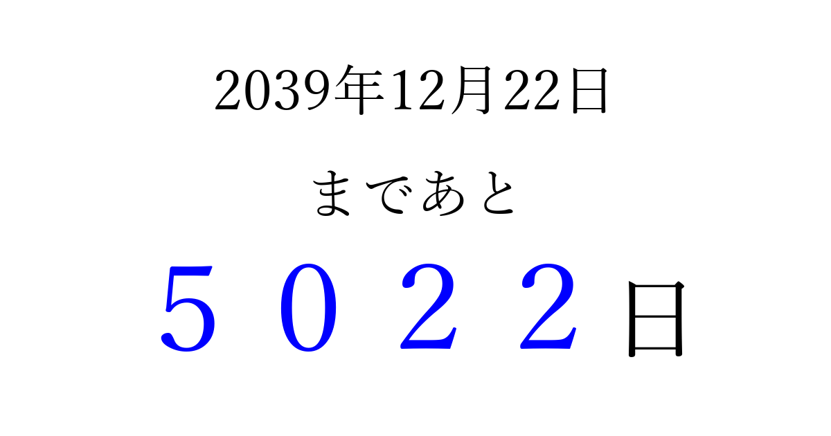 2039年12月22日(木)まで あと 9999 日です 追加すると、トップページからすぐ選べるようになります ※2026/03/23現在の結果です。 最新の状態に更新する ↓シェアして、タイムライン上にカウントダウンを表示しよう!↓ 📤 この結果を共有する Tweet シェア Threads Bluesky 別の日付でカウントダウン 2039年12月のカレンダー このページをブックマークに追加すると、いつでもカウントダウンを確認できます。 (PC: Ctrl+D / Mac: ⌘+D) hitome-notes.comでは以下のページも運営しています。 指定日と期間から日付を計算 | ガチャ確率計算・シミュレーション | プライバシー・ポリシー 運営者:Avocado