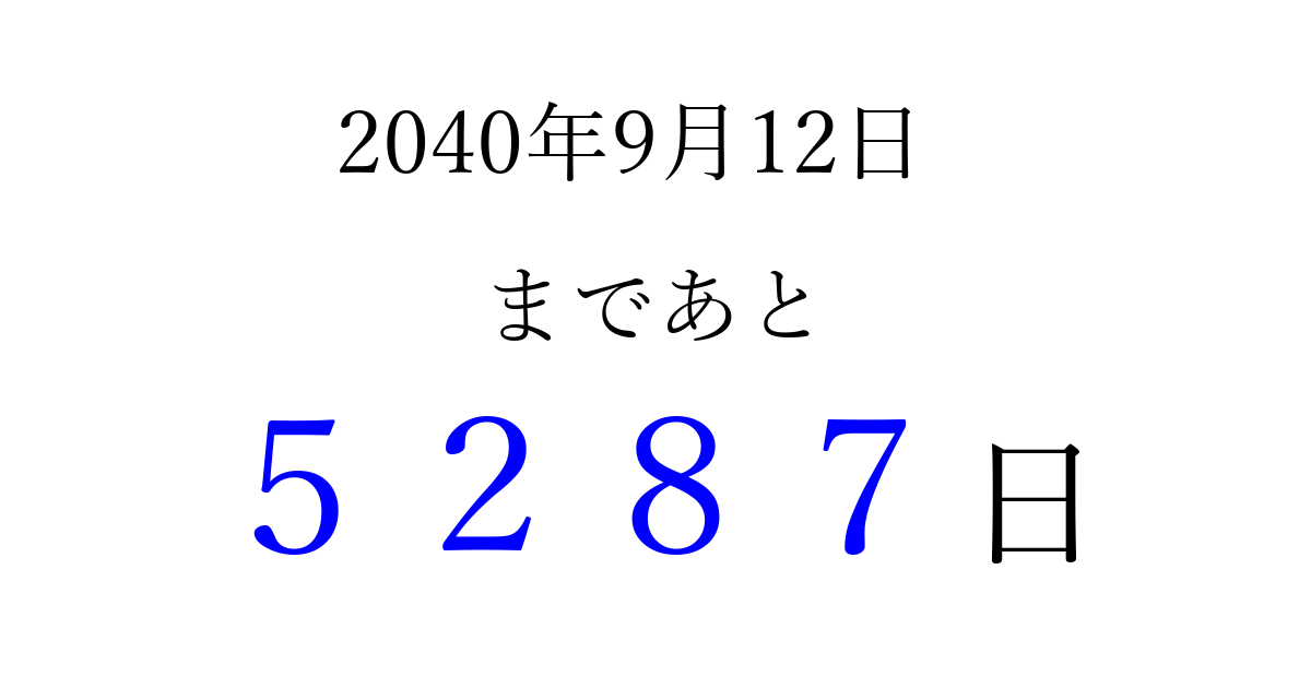 2040年9月12日(水)まで あと 9999 日です 追加すると、トップページからすぐ選べるようになります ※2026/03/23現在の結果です。 最新の状態に更新する ↓シェアして、タイムライン上にカウントダウンを表示しよう!↓ 📤 この結果を共有する Tweet シェア Threads Bluesky 別の日付でカウントダウン 2040年9月のカレンダー このページをブックマークに追加すると、いつでもカウントダウンを確認できます。 (PC: Ctrl+D / Mac: ⌘+D) hitome-notes.comでは以下のページも運営しています。 指定日と期間から日付を計算 | ガチャ確率計算・シミュレーション | プライバシー・ポリシー 運営者:Avocado