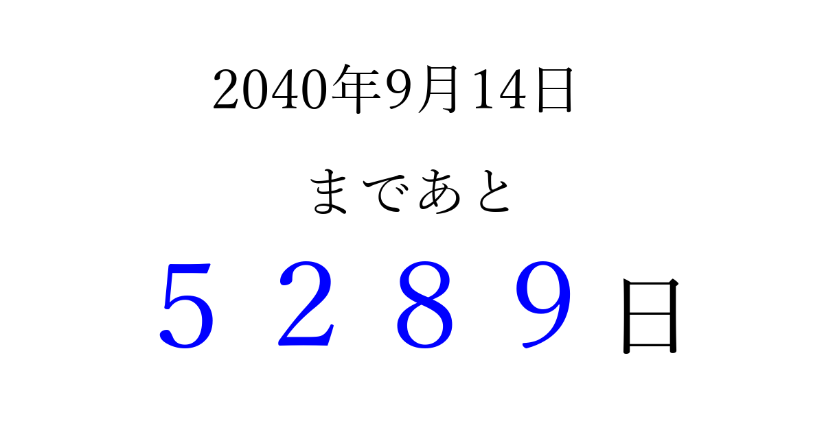 2040年9月14日(金)まで あと 9999 日です 追加すると、トップページからすぐ選べるようになります ※2026/03/23現在の結果です。 最新の状態に更新する ↓シェアして、タイムライン上にカウントダウンを表示しよう!↓ 📤 この結果を共有する Tweet シェア Threads Bluesky 別の日付でカウントダウン 2040年9月のカレンダー このページをブックマークに追加すると、いつでもカウントダウンを確認できます。 (PC: Ctrl+D / Mac: ⌘+D) hitome-notes.comでは以下のページも運営しています。 指定日と期間から日付を計算 | ガチャ確率計算・シミュレーション | プライバシー・ポリシー 運営者:Avocado