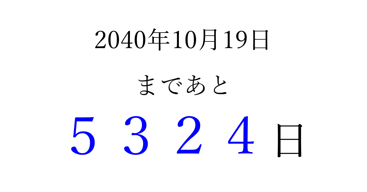 2040年10月19日(金)まで あと 9999 日です 追加すると、トップページからすぐ選べるようになります ※2026/03/23現在の結果です。 最新の状態に更新する ↓シェアして、タイムライン上にカウントダウンを表示しよう!↓ 📤 この結果を共有する Tweet シェア Threads Bluesky 別の日付でカウントダウン 2040年10月のカレンダー このページをブックマークに追加すると、いつでもカウントダウンを確認できます。 (PC: Ctrl+D / Mac: ⌘+D) hitome-notes.comでは以下のページも運営しています。 指定日と期間から日付を計算 | ガチャ確率計算・シミュレーション | プライバシー・ポリシー 運営者:Avocado