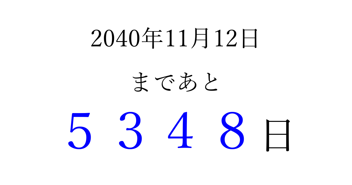 2040年11月12日(月)まで あと 9999 日です 追加すると、トップページからすぐ選べるようになります ※2026/03/23現在の結果です。 最新の状態に更新する ↓シェアして、タイムライン上にカウントダウンを表示しよう!↓ 📤 この結果を共有する Tweet シェア Threads Bluesky 別の日付でカウントダウン 2040年11月のカレンダー このページをブックマークに追加すると、いつでもカウントダウンを確認できます。 (PC: Ctrl+D / Mac: ⌘+D) hitome-notes.comでは以下のページも運営しています。 指定日と期間から日付を計算 | ガチャ確率計算・シミュレーション | プライバシー・ポリシー 運営者:Avocado