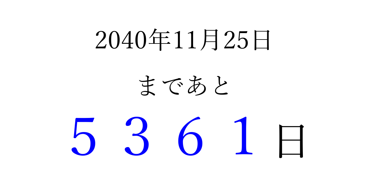 2040年11月25日(日)まで あと 9999 日です 追加すると、トップページからすぐ選べるようになります ※2026/03/23現在の結果です。 最新の状態に更新する ↓シェアして、タイムライン上にカウントダウンを表示しよう!↓ 📤 この結果を共有する Tweet シェア Threads Bluesky 別の日付でカウントダウン 2040年11月のカレンダー このページをブックマークに追加すると、いつでもカウントダウンを確認できます。 (PC: Ctrl+D / Mac: ⌘+D) hitome-notes.comでは以下のページも運営しています。 指定日と期間から日付を計算 | ガチャ確率計算・シミュレーション | プライバシー・ポリシー 運営者:Avocado