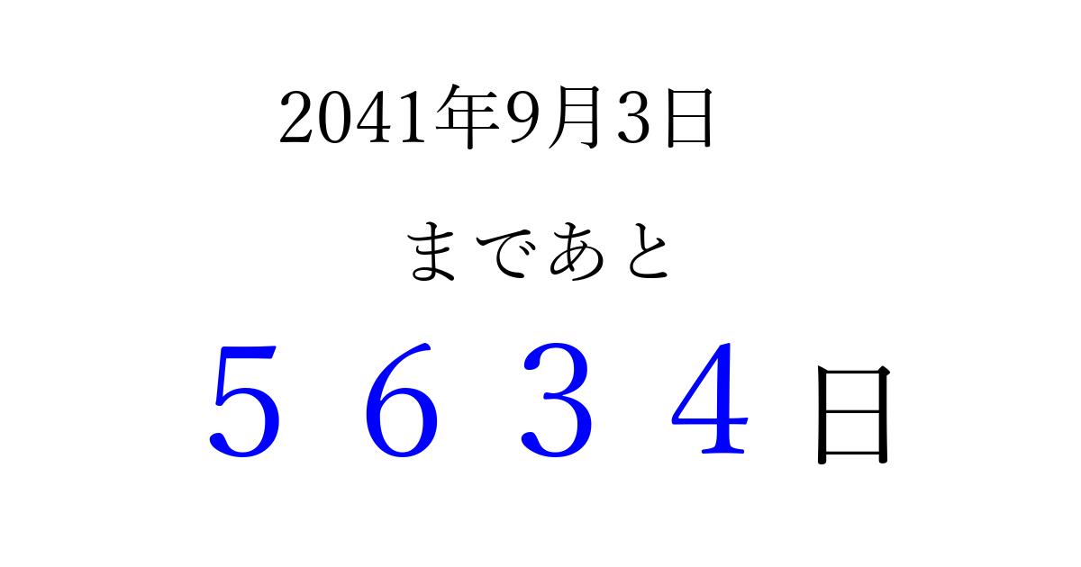 2041年9月3日(火)まで あと 9999 日です 追加すると、トップページからすぐ選べるようになります ※2026/04/01現在の結果です。 最新の状態に更新する ↓シェアして、タイムライン上にカウントダウンを表示しよう!↓ 📤 この結果を共有する Tweet シェア Threads Bluesky 別の日付でカウントダウン 2041年9月のカレンダー このページをブックマークに追加すると、いつでもカウントダウンを確認できます。 (PC: Ctrl+D / Mac: ⌘+D) hitome-notes.comでは以下のページも運営しています。 指定日と期間から日付を計算 | ガチャ確率計算・シミュレーション | プライバシー・ポリシー 運営者:Avocado