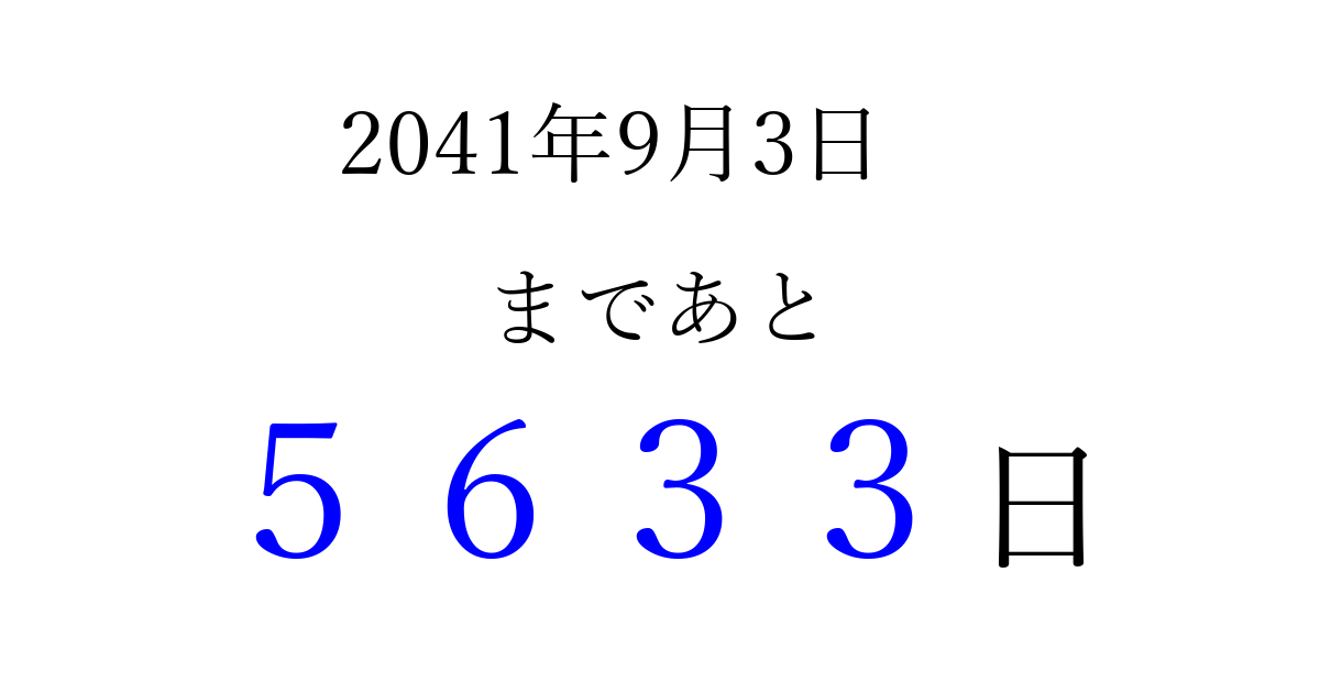 2041年9月3日(火)まで あと 9999 日です 追加すると、トップページからすぐ選べるようになります ※2026/04/02現在の結果です。 最新の状態に更新する ↓シェアして、タイムライン上にカウントダウンを表示しよう!↓ 📤 この結果を共有する Tweet シェア Threads Bluesky 別の日付でカウントダウン 2041年9月のカレンダー このページをブックマークに追加すると、いつでもカウントダウンを確認できます。 (PC: Ctrl+D / Mac: ⌘+D) hitome-notes.comでは以下のページも運営しています。 指定日と期間から日付を計算 | ガチャ確率計算・シミュレーション | プライバシー・ポリシー 運営者:Avocado