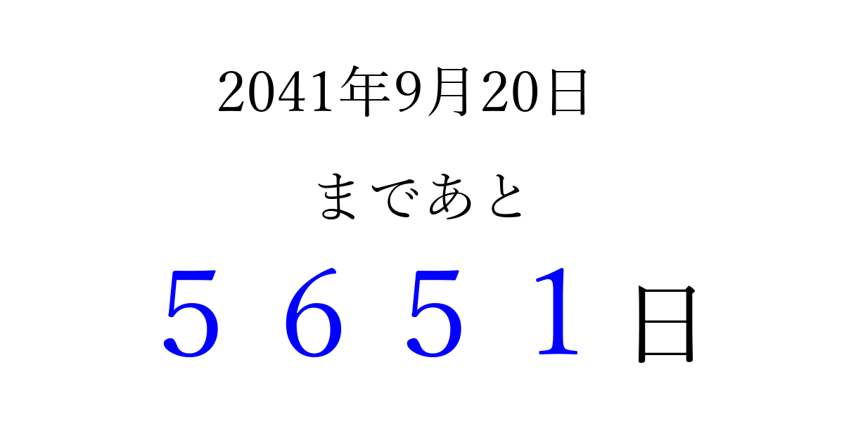 2041年9月20日(金)まで あと 9999 日です 追加すると、トップページからすぐ選べるようになります ※2026/04/01現在の結果です。 最新の状態に更新する ↓シェアして、タイムライン上にカウントダウンを表示しよう!↓ 📤 この結果を共有する Tweet シェア Threads Bluesky 別の日付でカウントダウン 2041年9月のカレンダー このページをブックマークに追加すると、いつでもカウントダウンを確認できます。 (PC: Ctrl+D / Mac: ⌘+D) hitome-notes.comでは以下のページも運営しています。 指定日と期間から日付を計算 | ガチャ確率計算・シミュレーション | プライバシー・ポリシー 運営者:Avocado