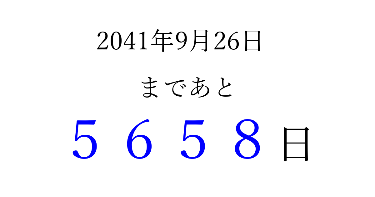 2041年9月26日(木)まで あと 9999 日です 追加すると、トップページからすぐ選べるようになります ※2026/03/31現在の結果です。 最新の状態に更新する ↓シェアして、タイムライン上にカウントダウンを表示しよう!↓ 📤 この結果を共有する Tweet シェア Threads Bluesky 別の日付でカウントダウン 2041年9月のカレンダー このページをブックマークに追加すると、いつでもカウントダウンを確認できます。 (PC: Ctrl+D / Mac: ⌘+D) hitome-notes.comでは以下のページも運営しています。 指定日と期間から日付を計算 | ガチャ確率計算・シミュレーション | プライバシー・ポリシー 運営者:Avocado